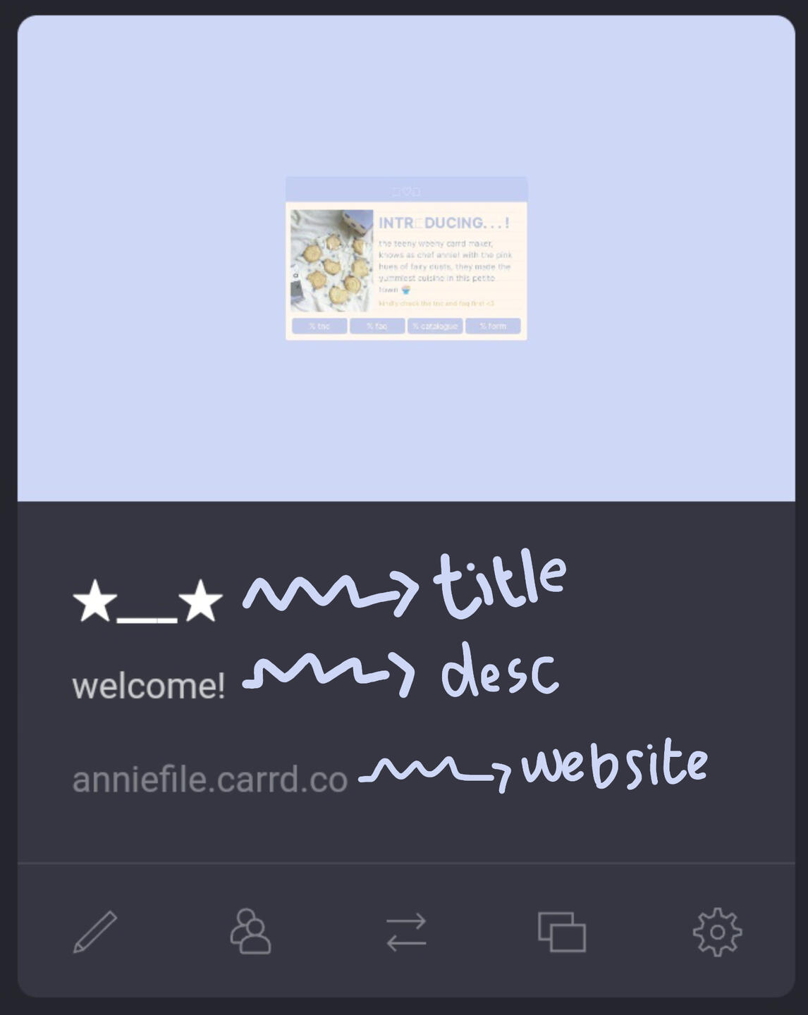 carrd description: (ini ditulis dengan deskripsi dari isi carrd, misal, "read carrd byf" atau "gina's page", dll. Lengkapnya cek di bagian faq <3)